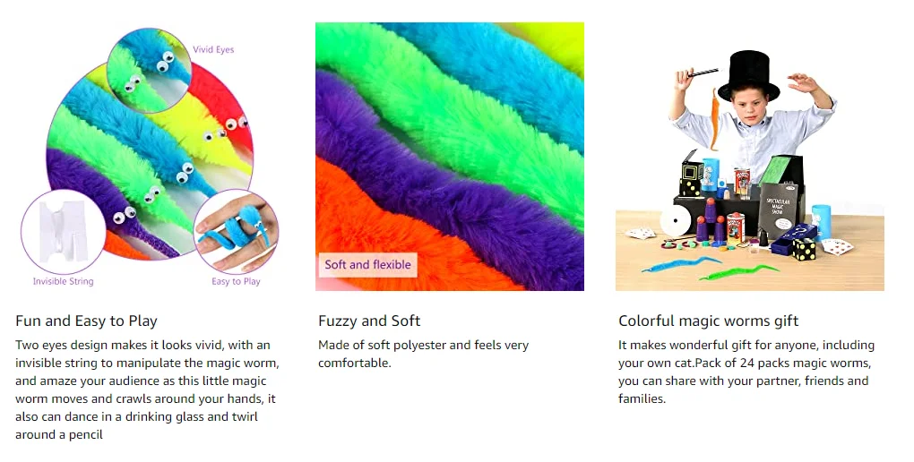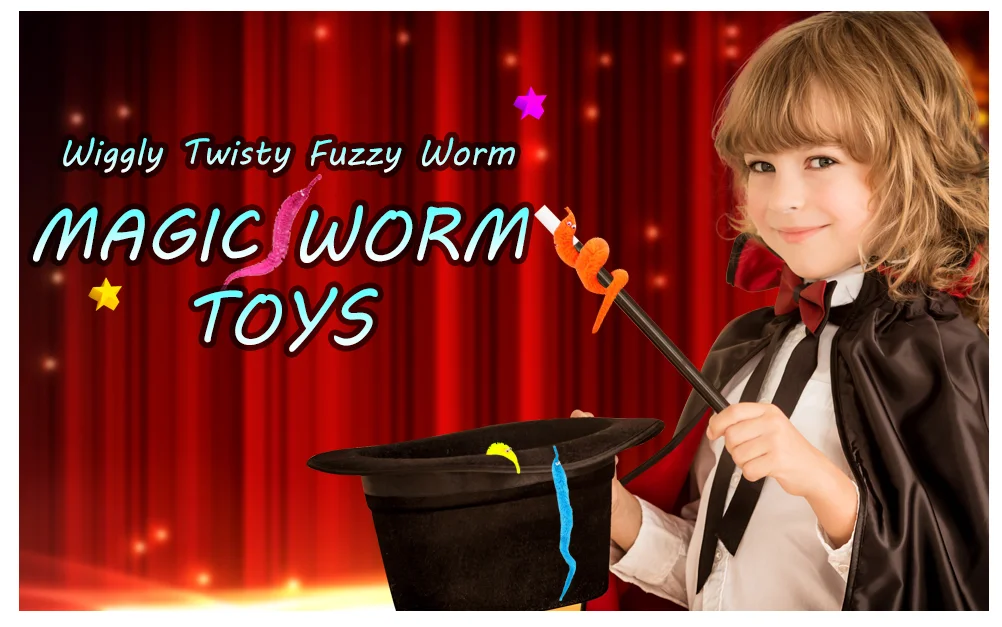 Fuzzy and soft: Cute magic worm for kids and adults. It is made of soft polyester and feels very comfortable. Two eyes make it look vivid, fuzzy and soft. Very cute little magic worms that can cause the child’s interest, Please stay by your children’s side the first time