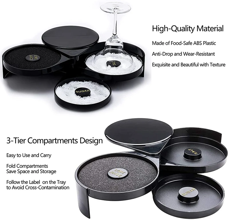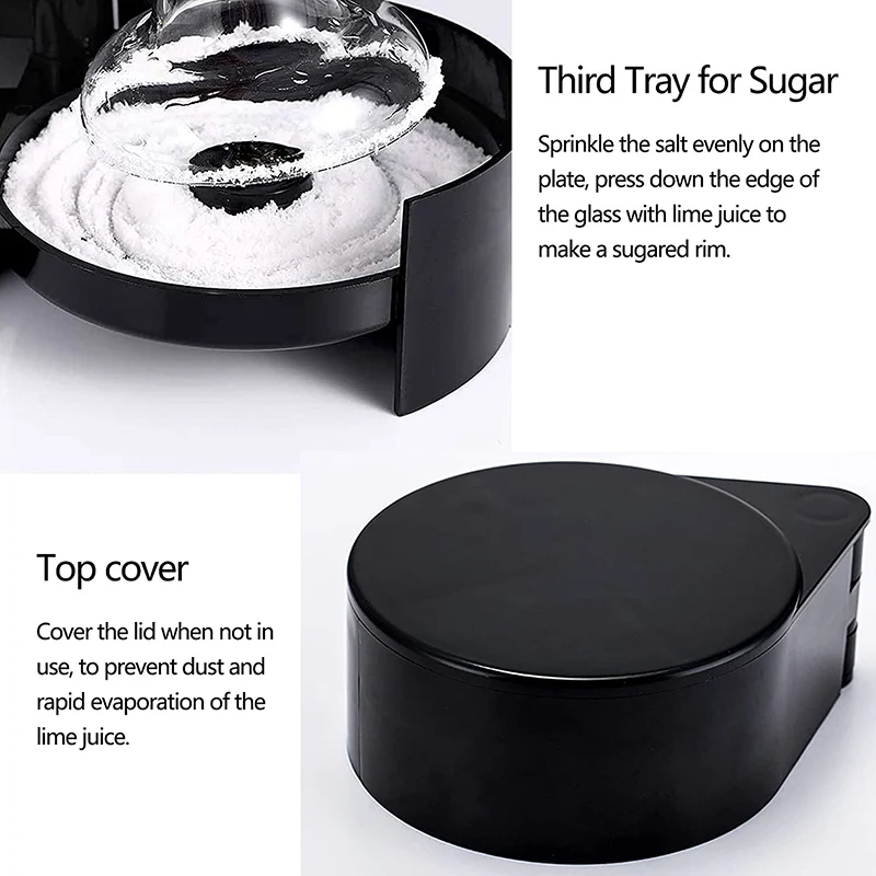 【3-Tier Glass Rimming Design】This margarita salt rimmer has a lightweight separate-tier compartment design saving space for storage and makes your home bar special. Labeled trays help identify the contents easily and avoid cross-contamination.