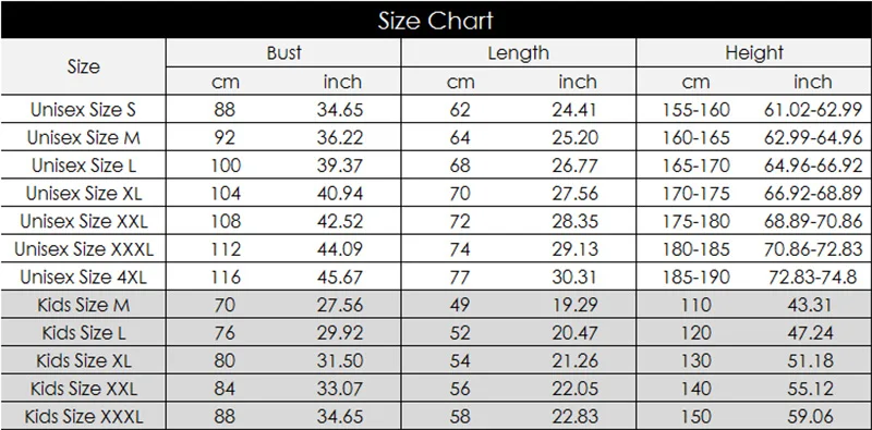 NOTE: 1.T-shirt is Asian Size, is smaller than US/EUR size, please check size chart before place an order.